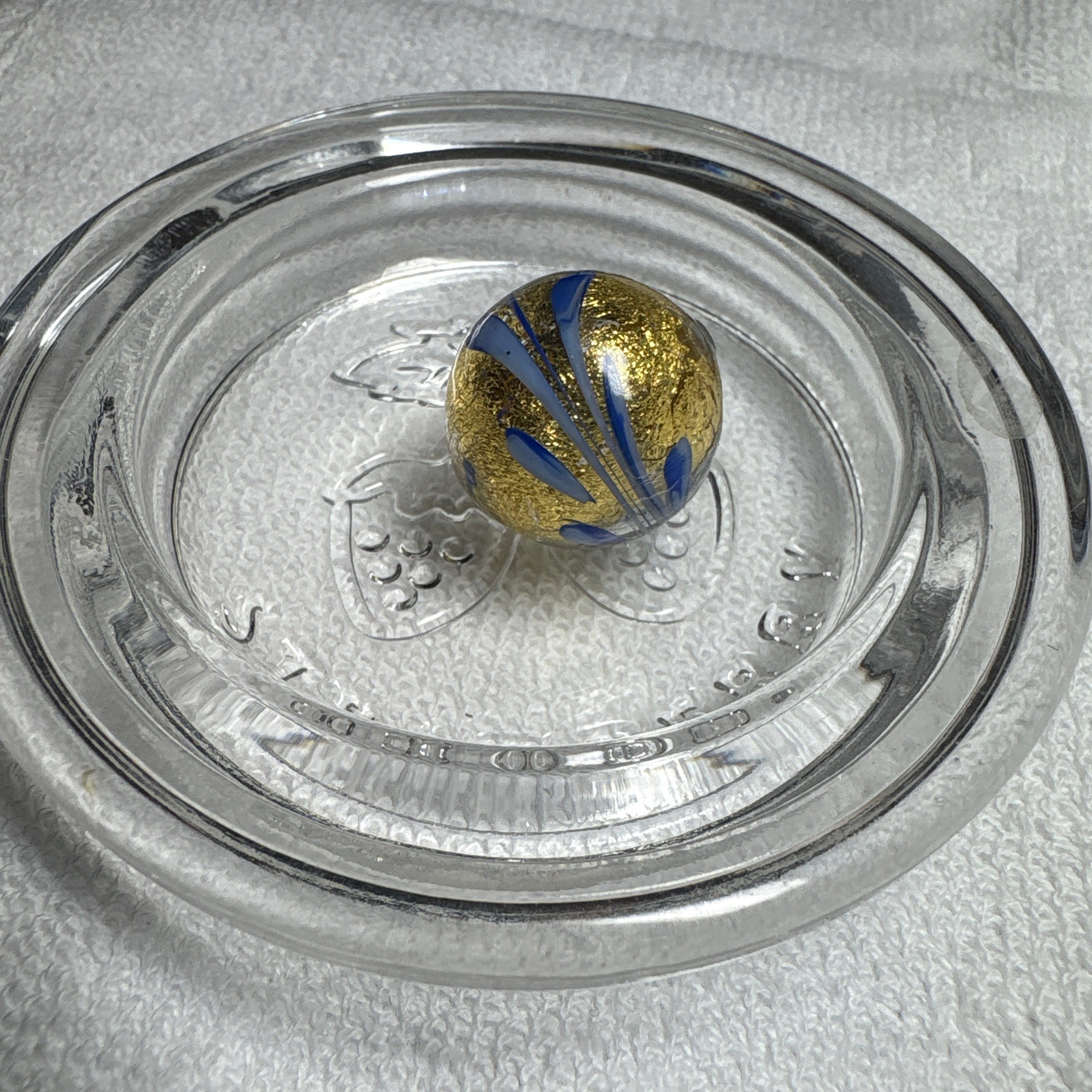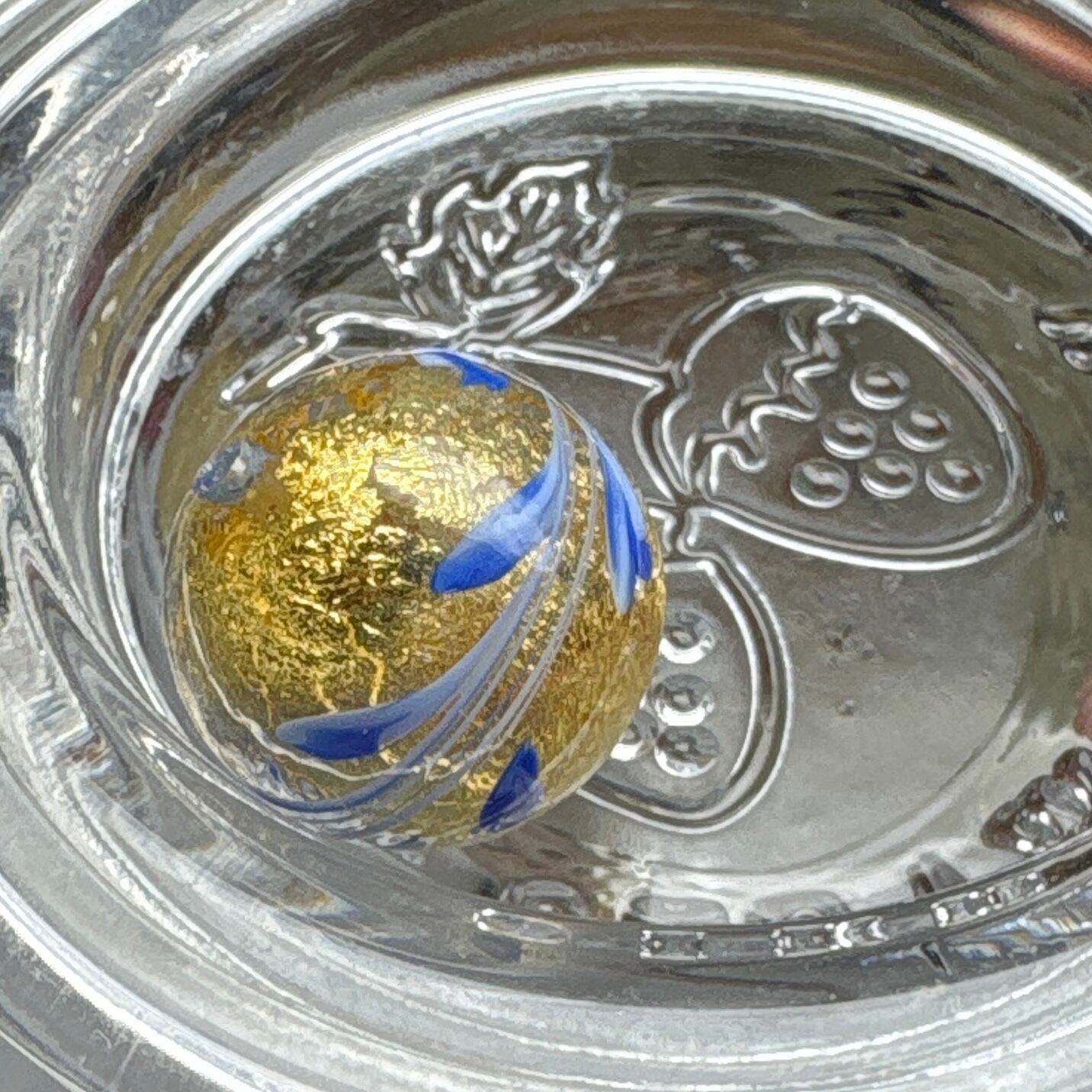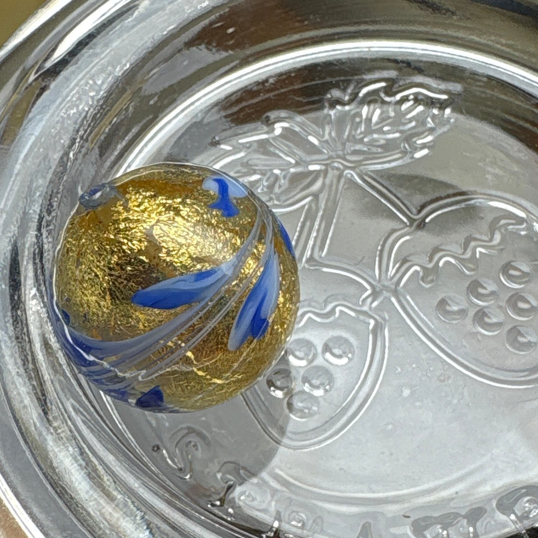 美しい透明ガラスの中に輝くゴールドが見え、洗練されたデザインが特徴の一品です。表面にはブルーとホワイトのガラスで施されたシンプルな模様があり、どんなシーンにもぴったりマッチします。ジュエリーやアート作品に使用することで、見る人を引きつける魅力を持っています。