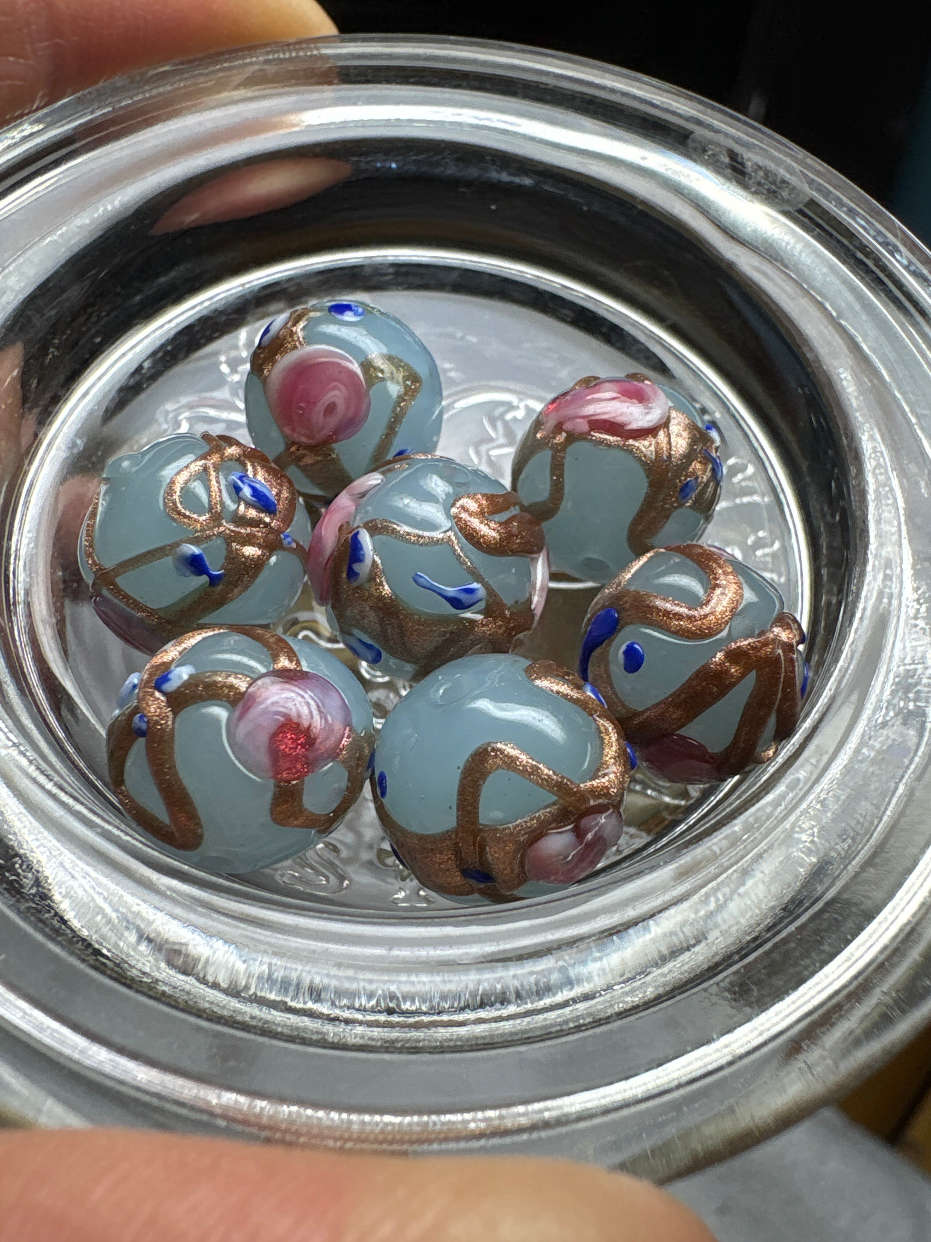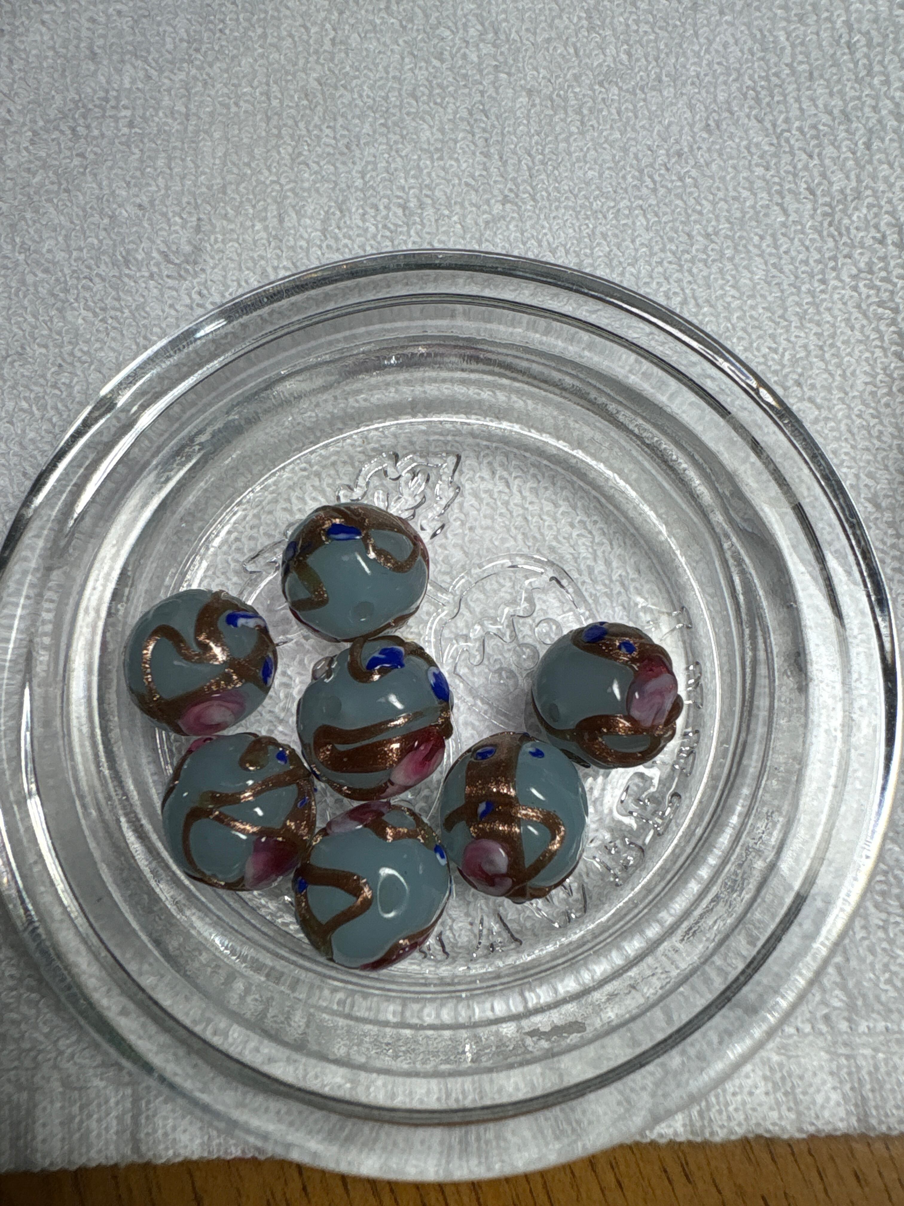 グレーがかった水色のガラスに銅色の線、薔薇の花を見立てたピンクとブルーの小花、ヴェネチアンビーズらしい模様のビーズです。